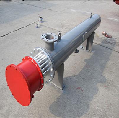 管道加熱器分為兩種模式:一種是采用管道加熱器內(nèi)部的法蘭式管狀電熱元件倒插在管道加熱器中的反應(yīng)釜夾套中加熱導(dǎo)熱油,將管道加熱器中的熱能傳輸給管道加熱器內(nèi)部反應(yīng)釜中的化工原料。